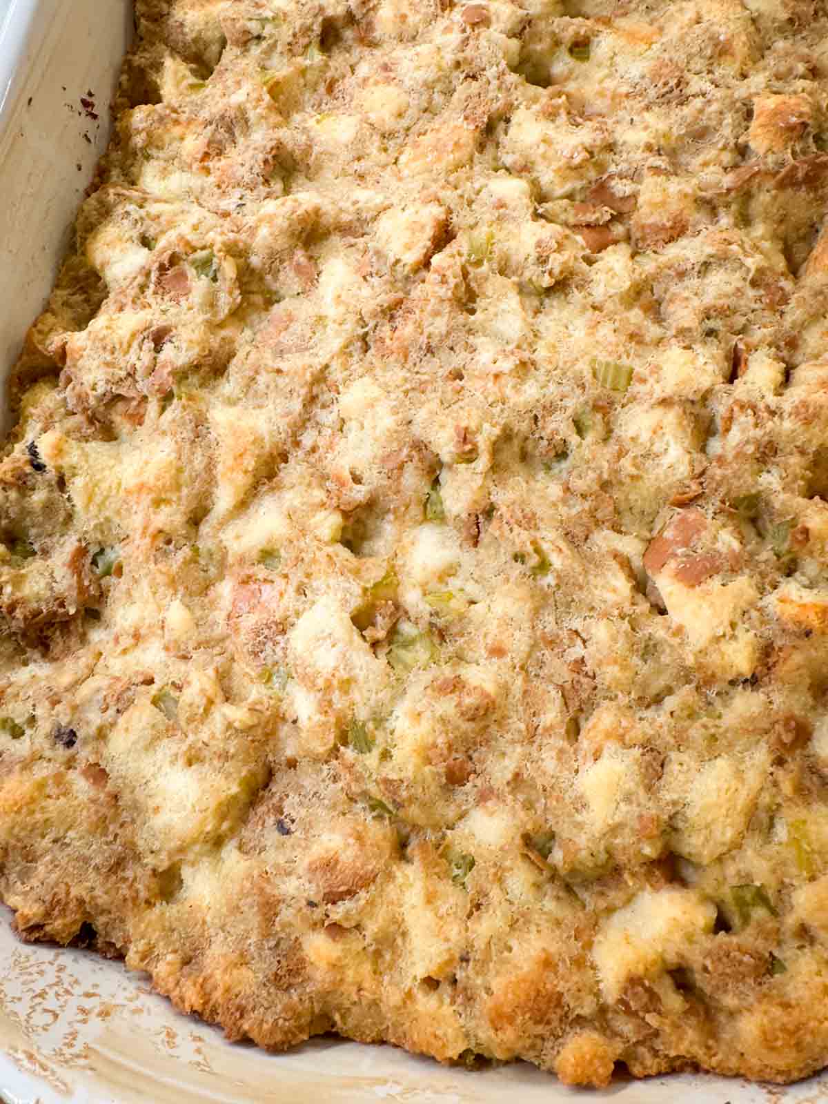 Reheat: Cover with foil and bake at 325°F for 20-25 minutes, then uncover for the last 5 minutes to crisp the top. The stuffing should be hot and steamy in the center when ready to serve.