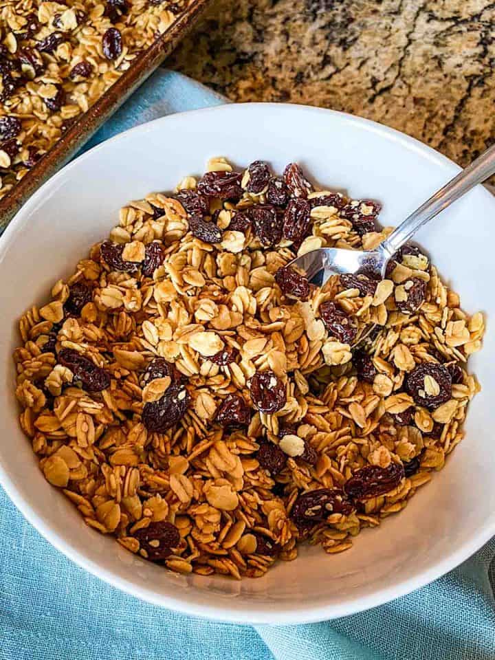 Make this easy homemade honey granola recipe with rolled oats, honey, and olive oil. It's quick, pantry-friendly, and softer than crunchy granola-perfect for breakfast, yogurt bowls, or school snacks.
